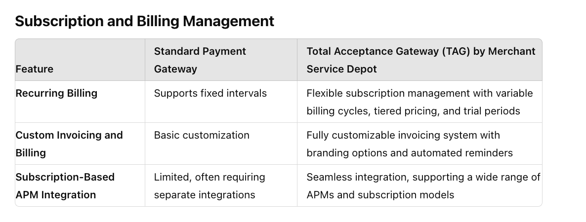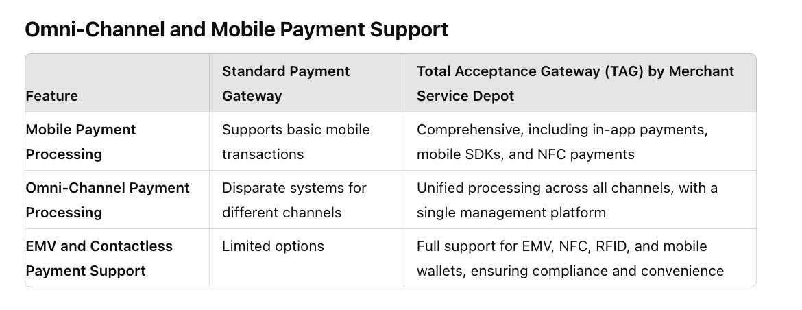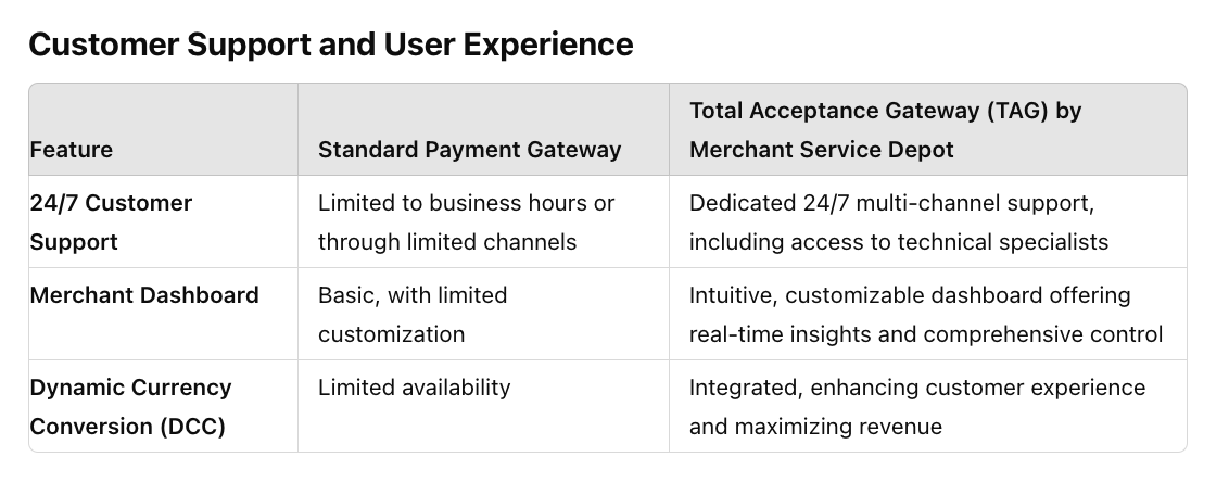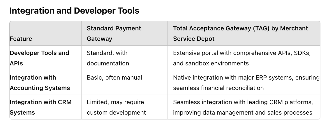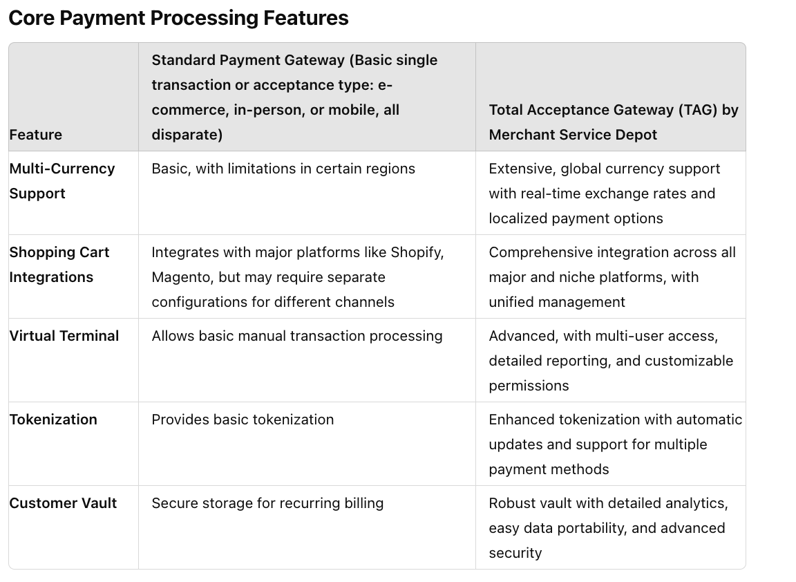 This guide provides a comprehensive comparison between traditional payment gateways and Merchant Service Depot’s Total Acceptance Gateway (TAG), segmented by key functionalities. Each section also explores scenarios where a sales representative can either win or lose a deal based on how these features are presented.